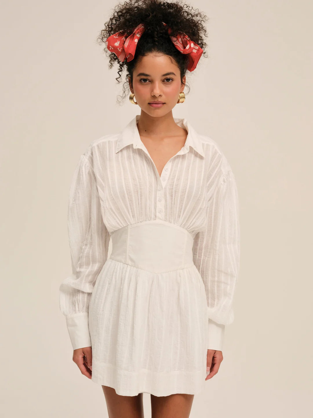 Inspired by men's tailoring, the Charlie white mini dress exudes timeless simplicity. This cotton mini dress is crafted in a subtle striped linen and features a pointed collar, placket with functional buttons, and corset style waistband with a functional lace-up detail at the center-back.