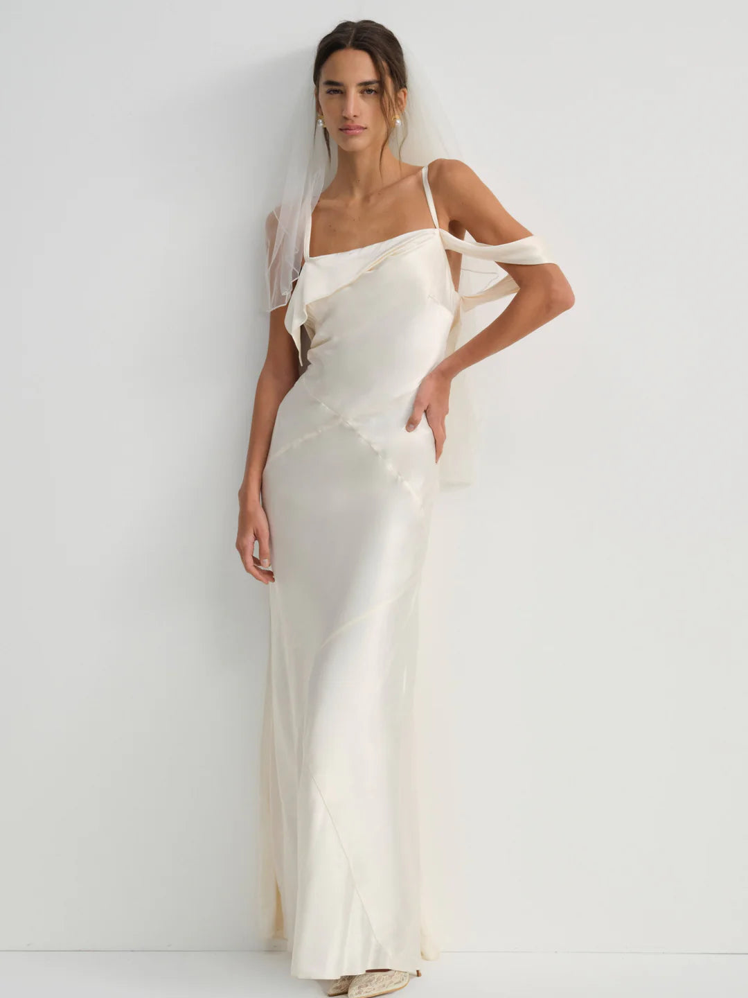 Undeniably feminine, the Jewel ivory dress is inspired by vintage evening gowns. Featuring an asymmetrical neckline, this silky dress has a suggestive off-the-shoulder sleeve and a draped ruffle detail at the back.